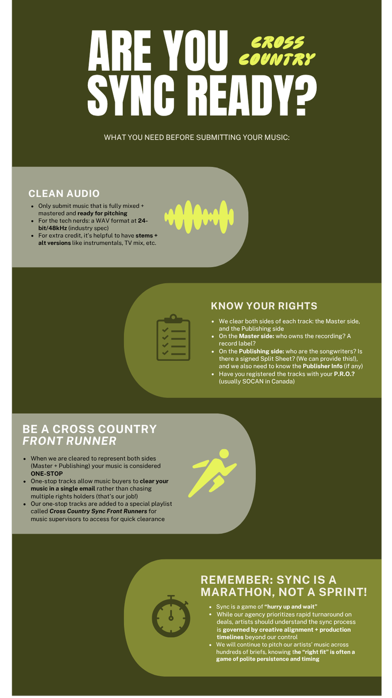 100% Artist-Owned: You keep 100% ownership of your copyrights (Master/Publishing/whatever you represent), only allowing Cross Country to represent + license it for synchronization